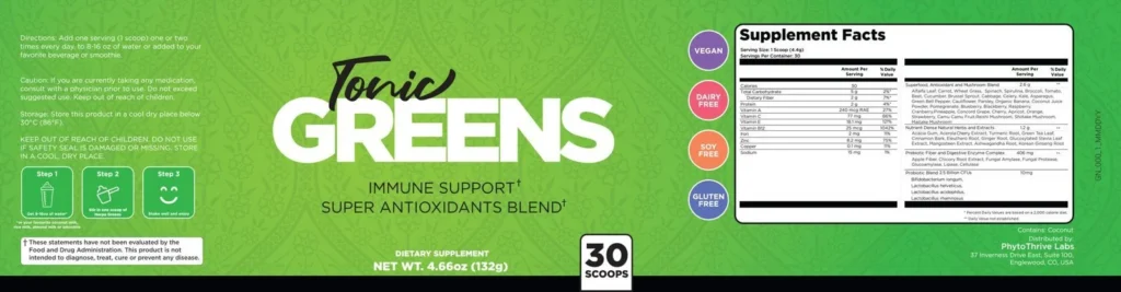 is a tonic greens powdered supplement designed as a functional “green mix,” bringing together antioxidants, phytonutrients, vitamins, minerals, and probiotics in a blend of over 57 ingredients. Its main appeal is convenience: instead of taking multiple separate products, you can simply mix one daily scoop into water or a smoothie to get broad wellness support.